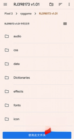 3、找到刚才解压好的游戏文件夹,点击下方的“使用本目录文件”按钮来添加游戏(如果游戏不是用RPGMakerMV制作的,系统会弹出提示信息)。