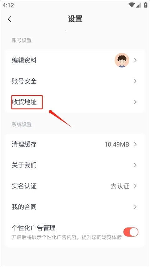 2、在设置页面中,点选收货地址;