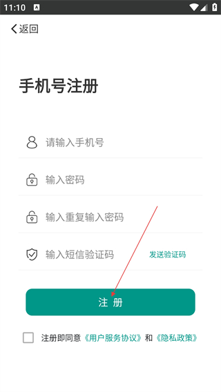 4、进入手机号注册页面后,按顺序填写手机号、密码和验证码,勾选相关协议,再点击【注册】按钮,即可完成账号注册操作。