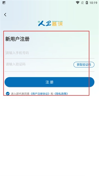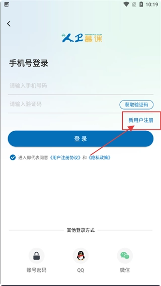 4、在新用户注册页面,输入手机号并获取验证码,同意用户注册协议和隐私政策后点击注册即可完成操作。