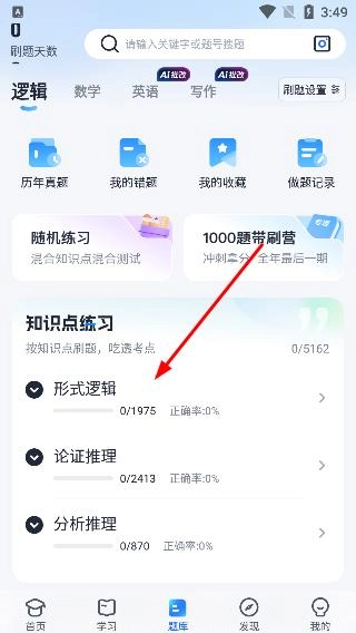 1、在“知识点练习”板块点击【形式逻辑】,进入形式逻辑的细分知识点页面。