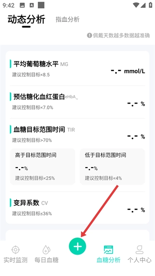 1、在血糖分析页面,点击底部绿色【+】按钮可展开功能菜单。