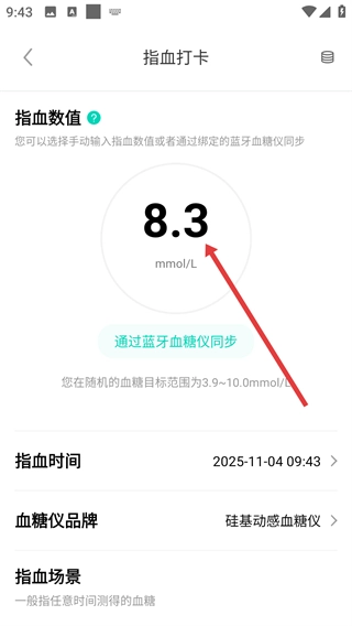 3、在指血打卡页面,可手动输入或通过蓝牙血糖仪同步【指血数值】。