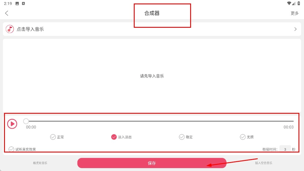 4、也可点击【合成器-功能选项】,导入音乐后设置相关参数,再点击【保存-功能按钮】完成音乐合成。