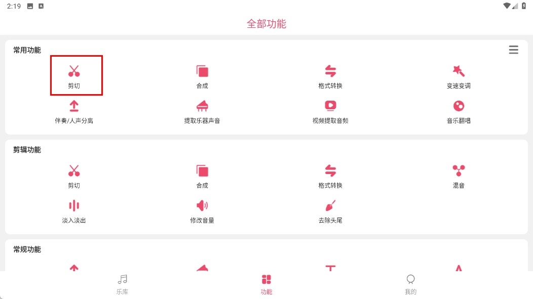 2、在全部功能页面点击【剪切-功能选项】,进入剪切音乐页面。