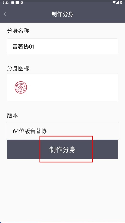 3、进入应用分身设置页,确认分身名称、图标等信息后,点击【制作分身-功能按钮】。