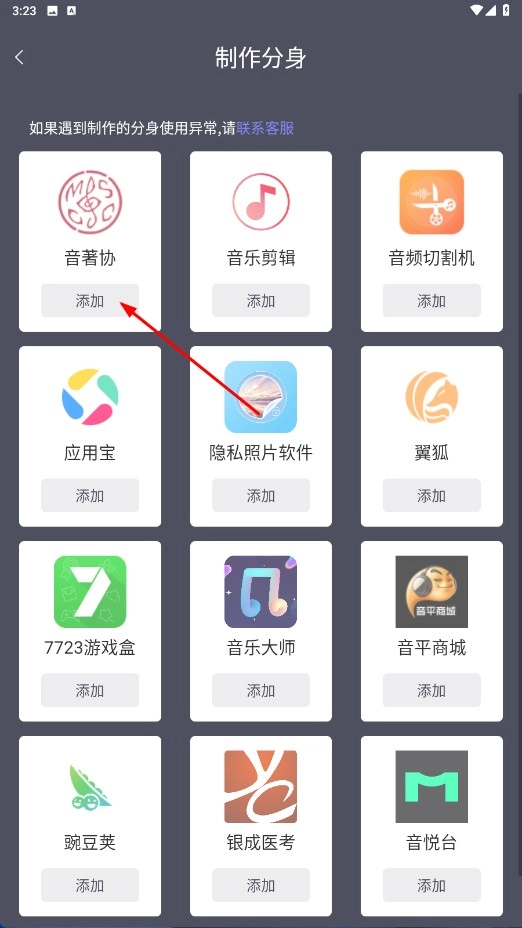 2、在制作分身页面,选择要创建分身的应用,如【音著协-应用图标】并点击添加。