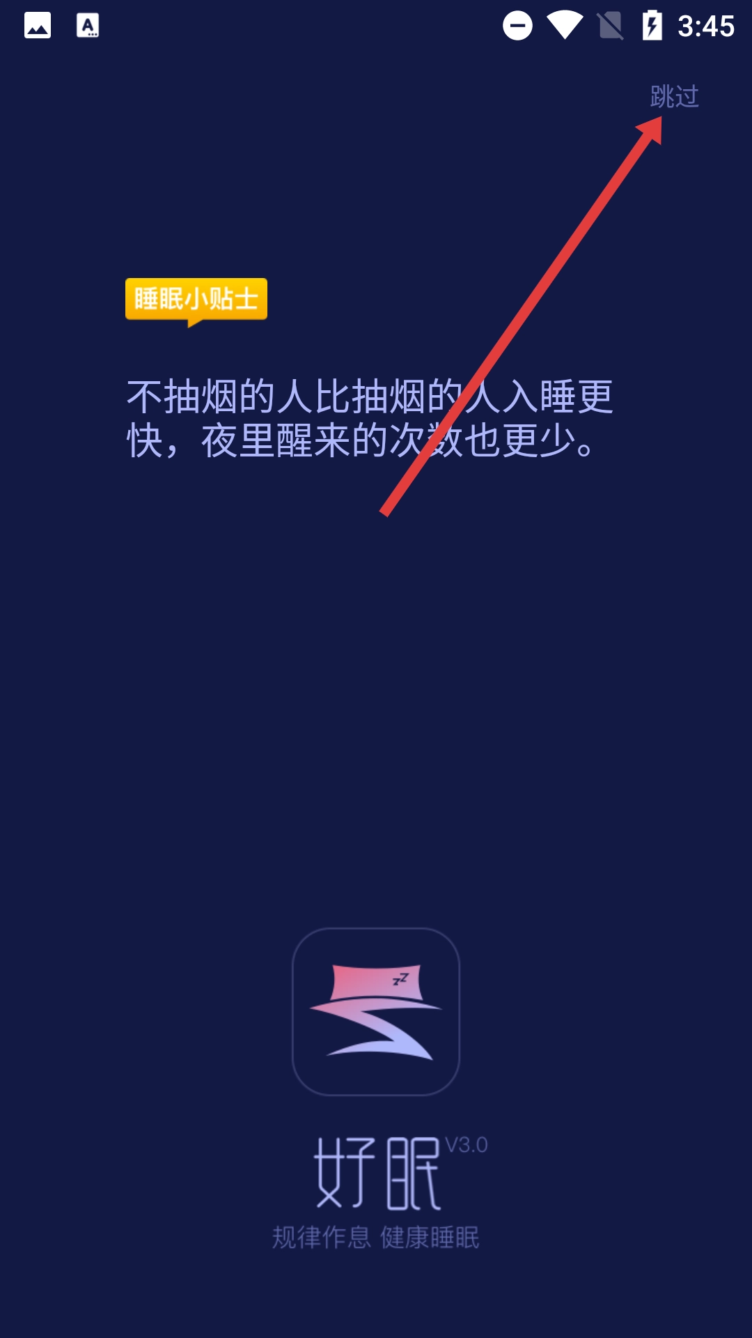 1、在好眠App的启动提示页面,点击右上角【跳过】按钮,进入睡眠习惯主界面。