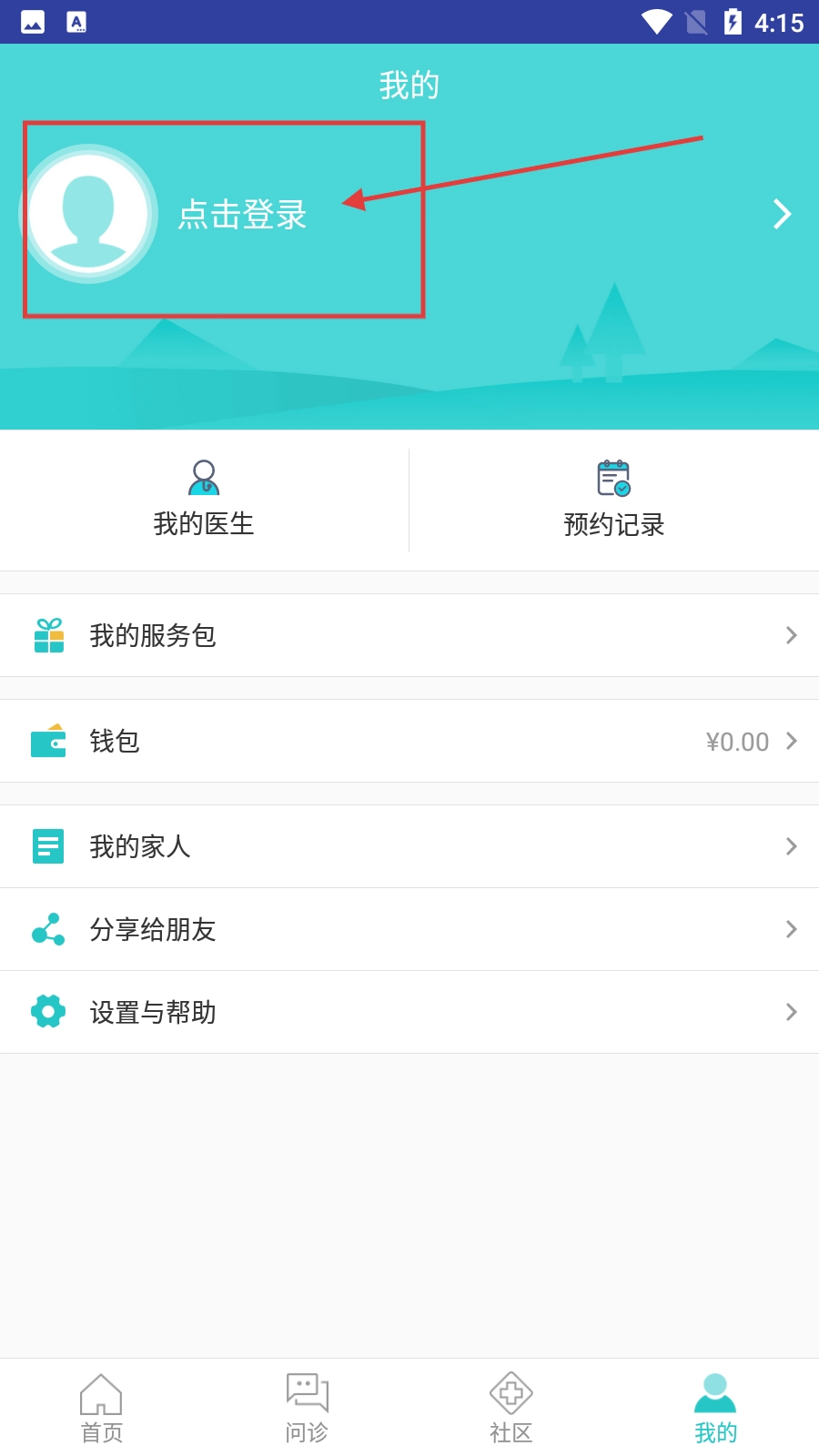 2、在个人中心界面,点击【点击登录】区域,进入登录注册选择界面。