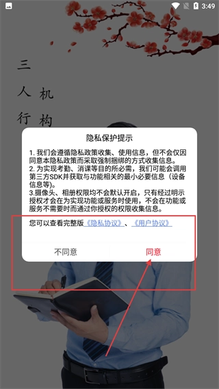 1、进入软件后,会弹出【隐私保护提示】框,点击【同意】按钮,可继续使用软件服务。