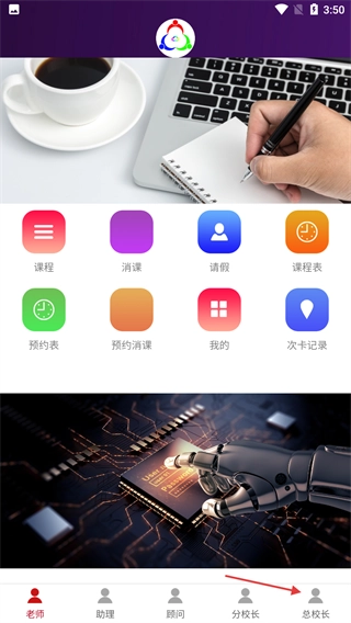 2、同意隐私保护提示后,进入功能界面,点击右下角【总校长】按钮,可进入会员登录页面。