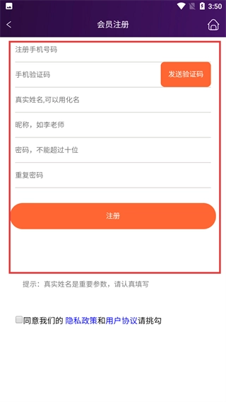 4、进入会员注册界面后,依次填写注册手机号码、手机验证码、真实姓名、昵称l流程,点击【注册】按钮,完成注册操作。