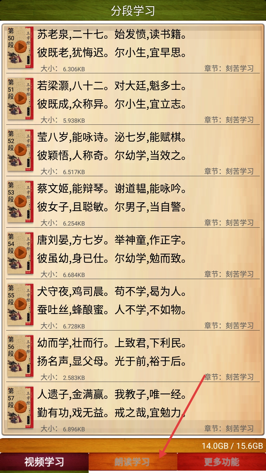 1、在《三字经》学习中,点击下方【朗读学习】按钮,可进入朗读学习页面。