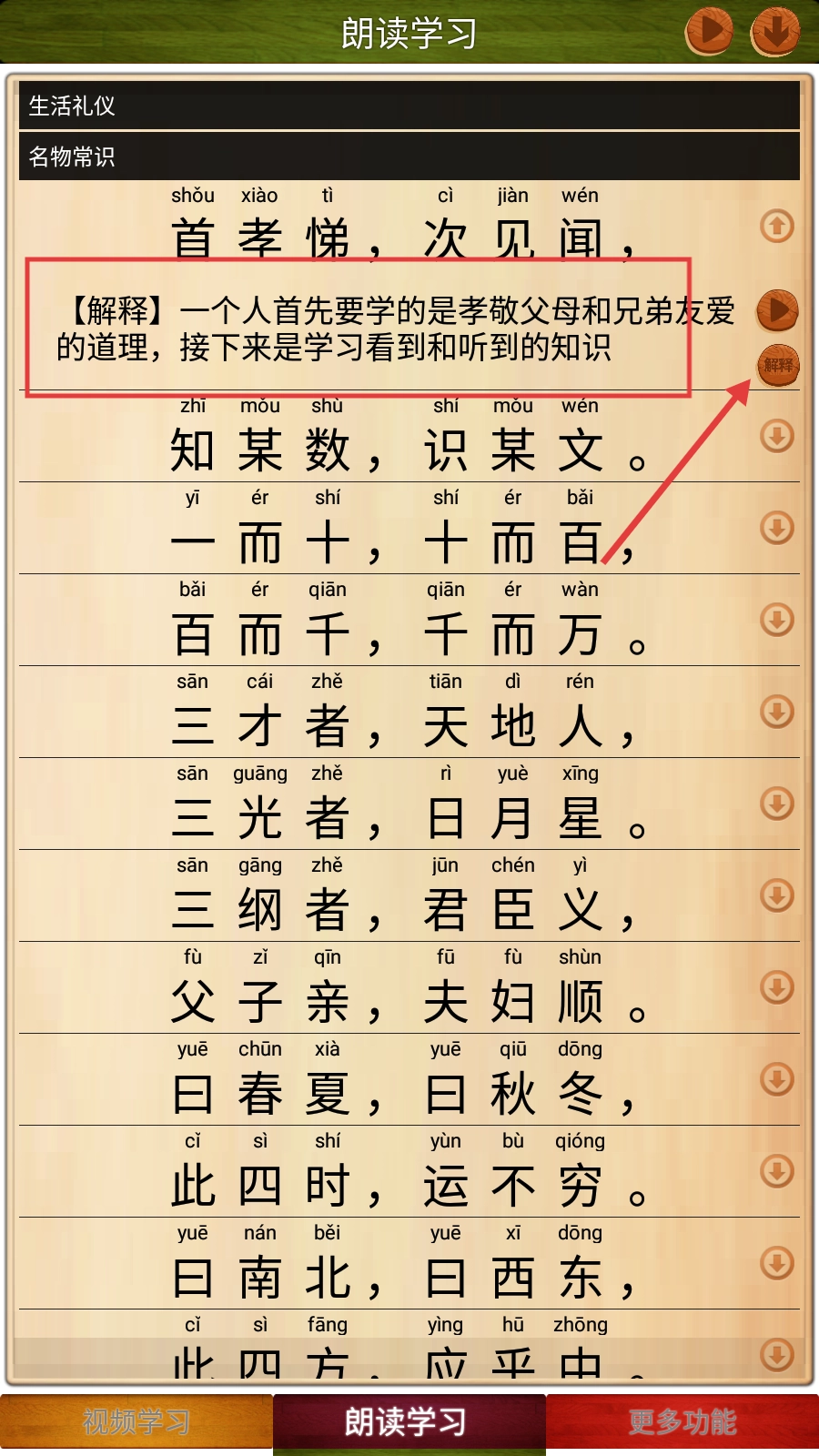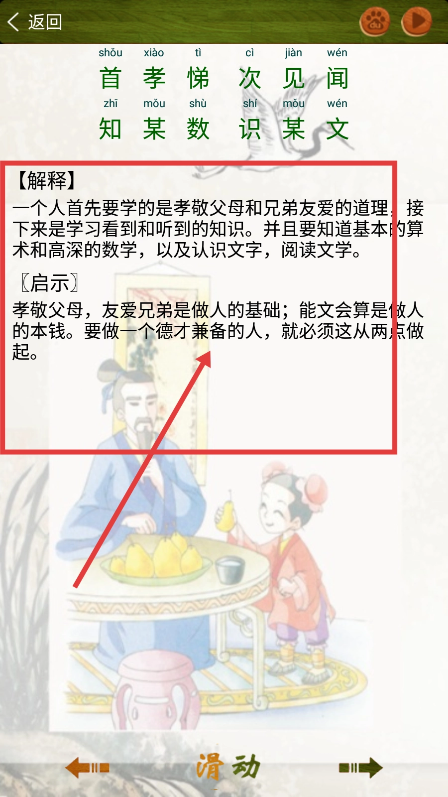 4、查看解释内容时,可看到对应的【解释】和【启示】信息,帮助深入理解《三字经》的含义与教育意义。