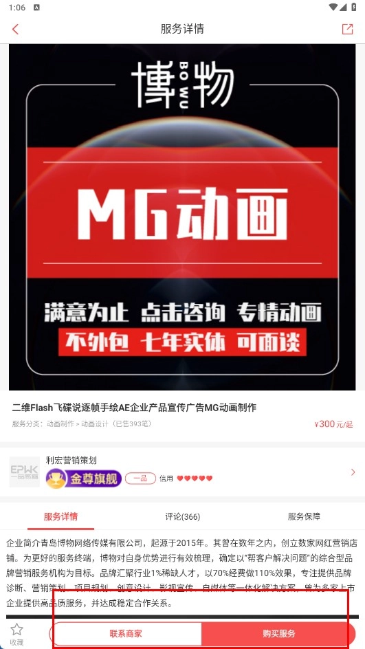 进入服务详情页面后,您可以点击【联系商家】按钮咨询服务相关问题,也可以点击【购买服务】按钮直接购买该服务。