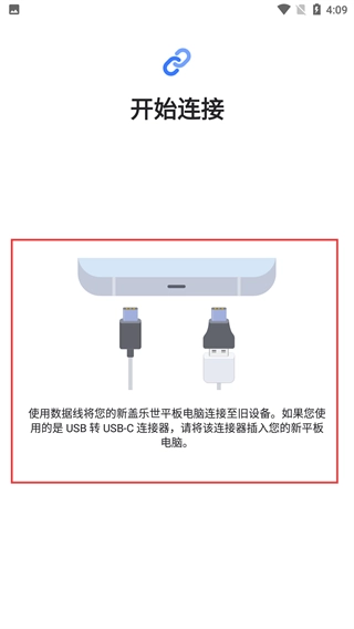 4、若选择数据线连接,按照提示使用数据线将新盖乐世平板电脑连接至旧设备,将连接器插入新平板电脑,完成设备连接。