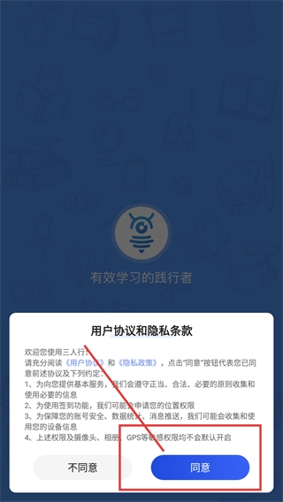 1、进入软件后,会弹出【用户协议和隐私条款】提示框,点击【同意】按钮,可继续使用软件服务。