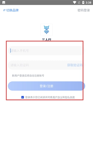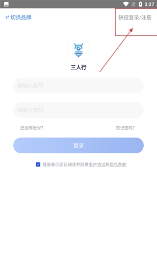 3、在三人行平台登录界面,点击右上角【快捷登录/注册】按钮,可进入快捷登录注册流程。