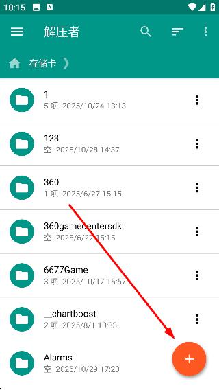 1、在解压者的存储卡界面中,点击右下角的橙色【+】按钮,此时会弹出操作选项菜单。