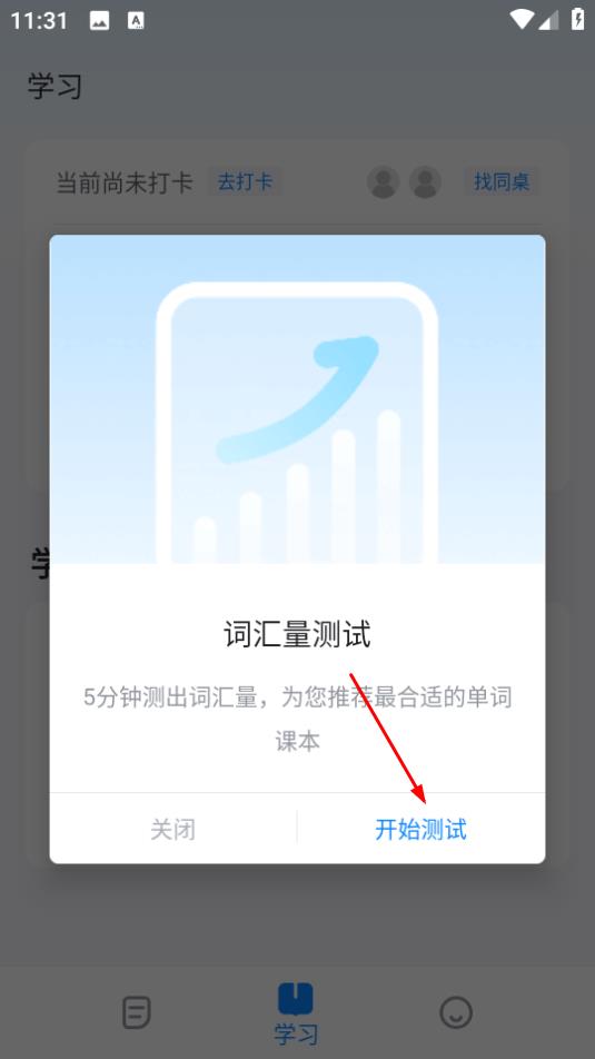 1在学习界面中,点击“选择课本”选项后,系统会自动弹出词汇量测试的窗口。