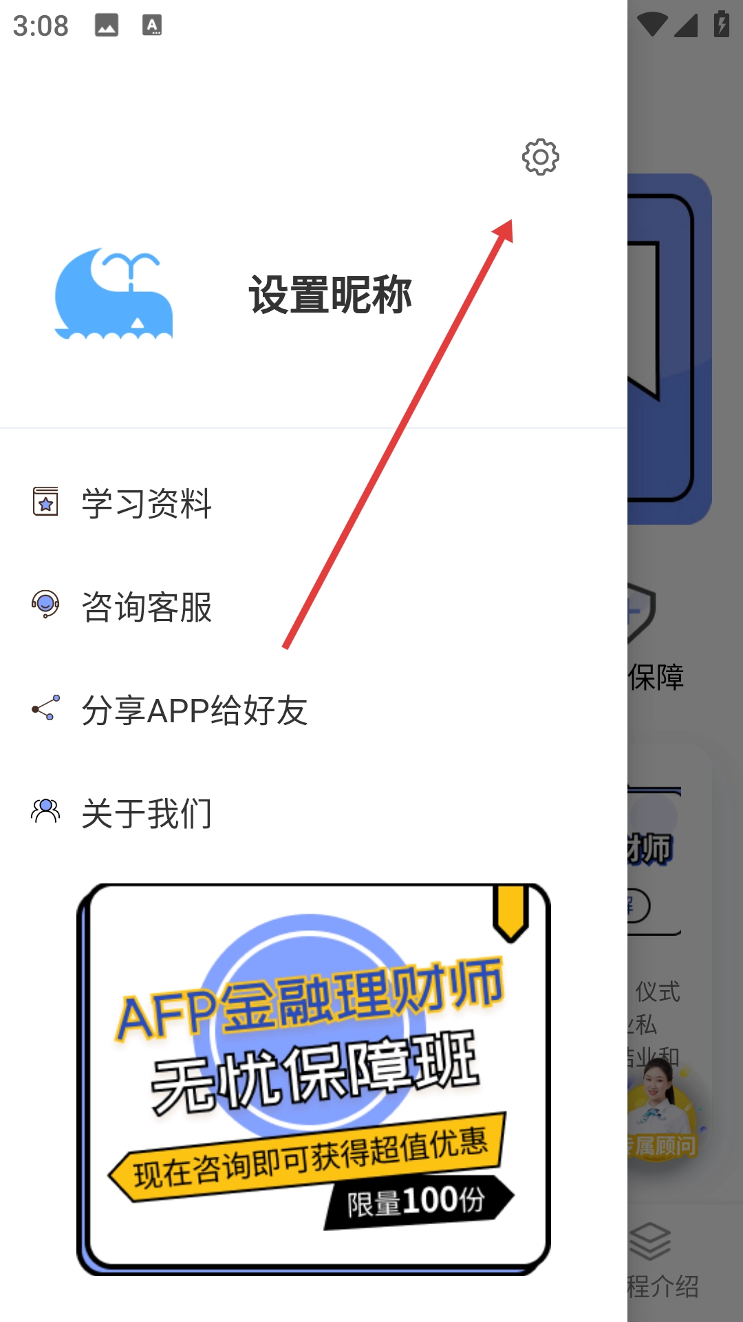 1、点击左上角的图标,展开侧边栏后,就能看到设置昵称、学习资料等功能板块,以及设置图标。