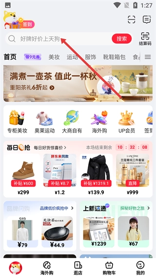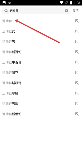 1、打开首页后,点击页面顶部的搜索框,输入关键词“运动鞋”,在弹出的搜索建议里选中“运动鞋”这一选项,即可跳转至搜索结果页面。