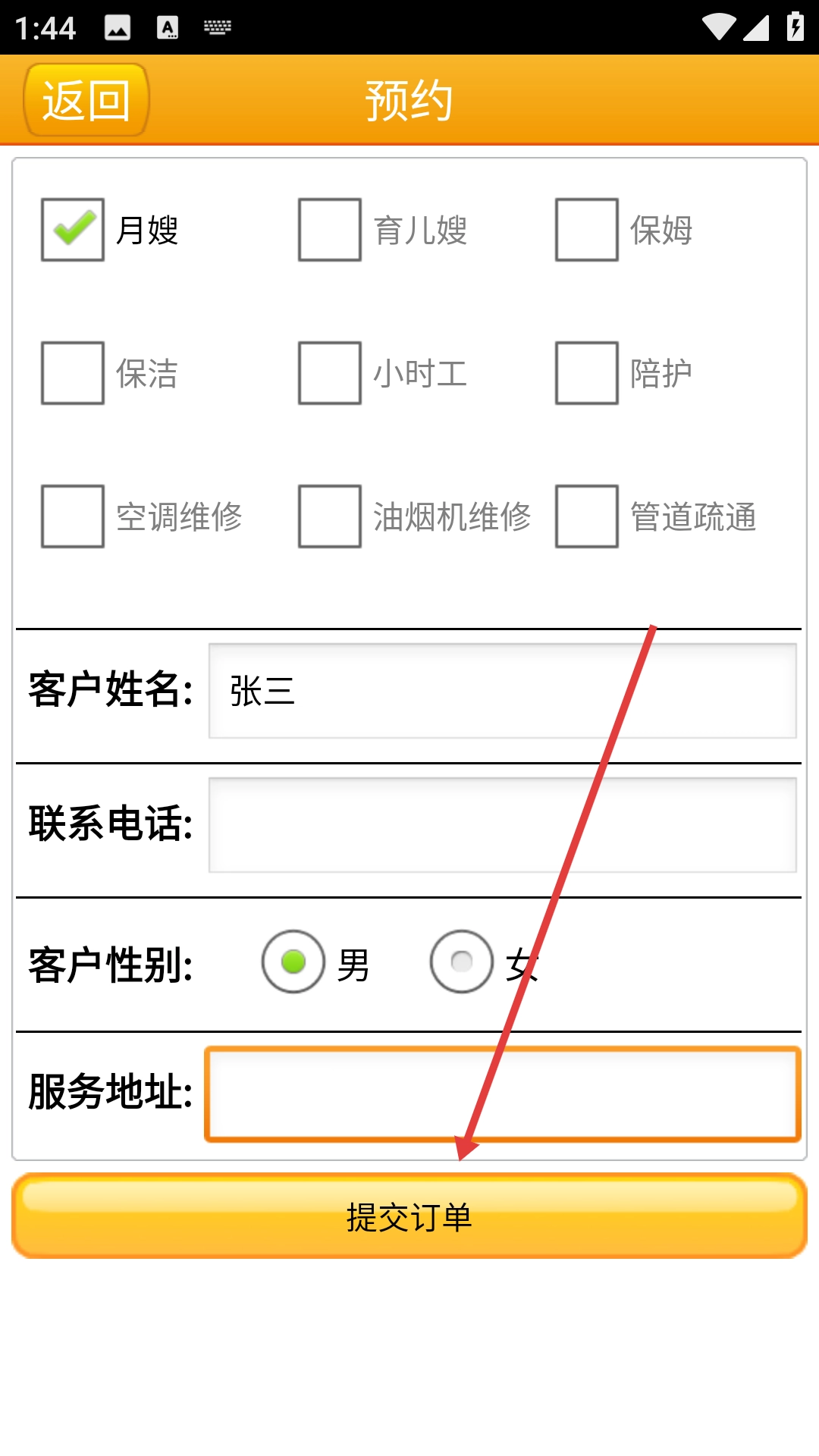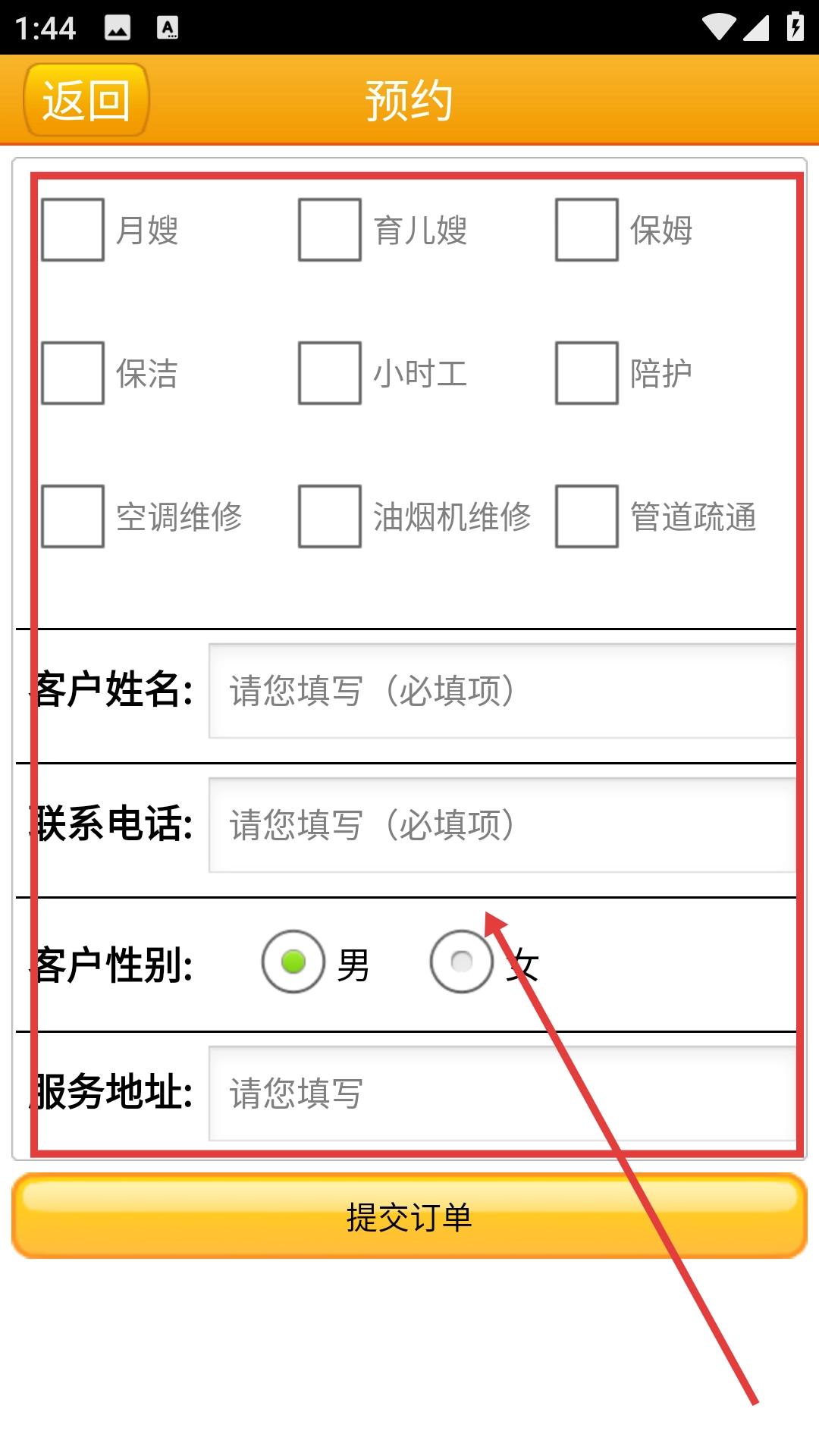 3、进入预约页面后,勾选需要的服务类型(例如月嫂服务),接着填写客户姓名、联系电话、服务地址等必须填写的信息。