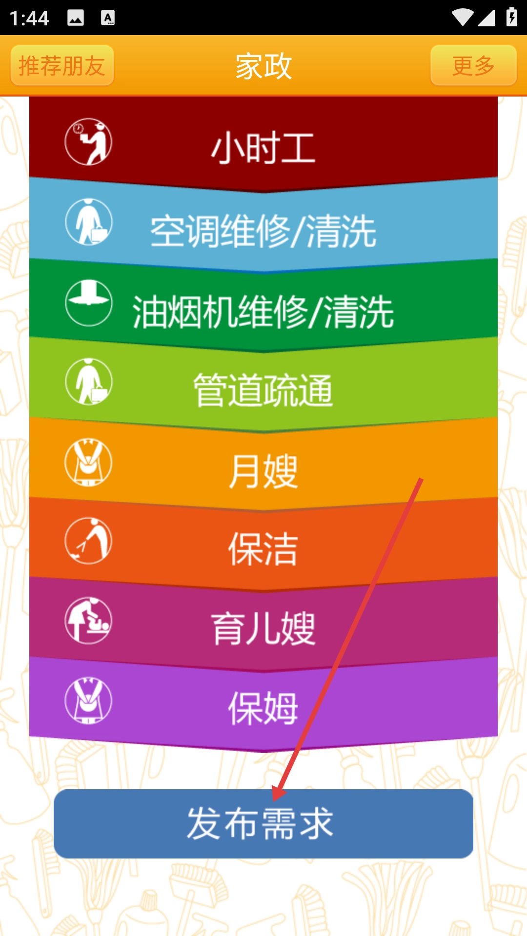 2、在家政服务页面点击【发布需求】按钮,即可进入预约信息的填写页面。