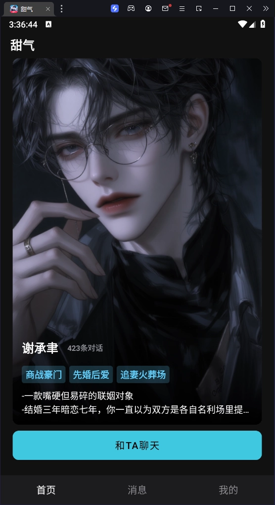 2、进入首页后滑动页面就能挑选心仪的角色,点击“和TA聊天”即可进入对话界面。