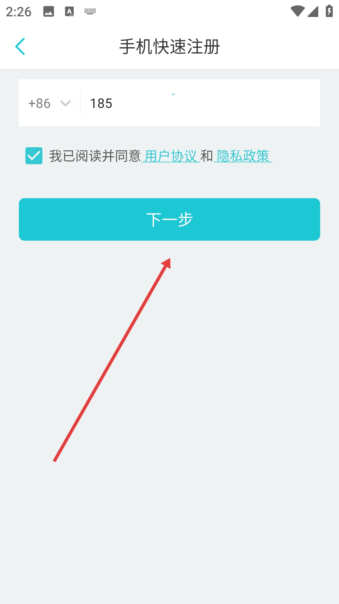 2、在注册页面输入手机号,勾选“我已阅读并同意用户协议和隐私政策”后,点击【下一步】。