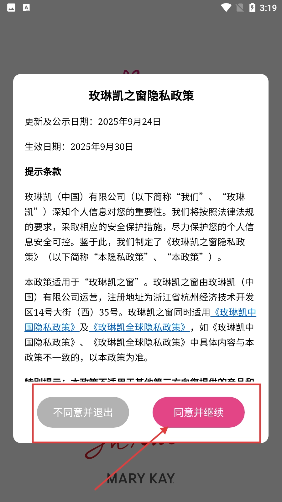 1、使用玫琳凯之窗前,需阅读《玫琳凯之窗隐私政策》,点击【同意并继续】按钮方可进入软件。