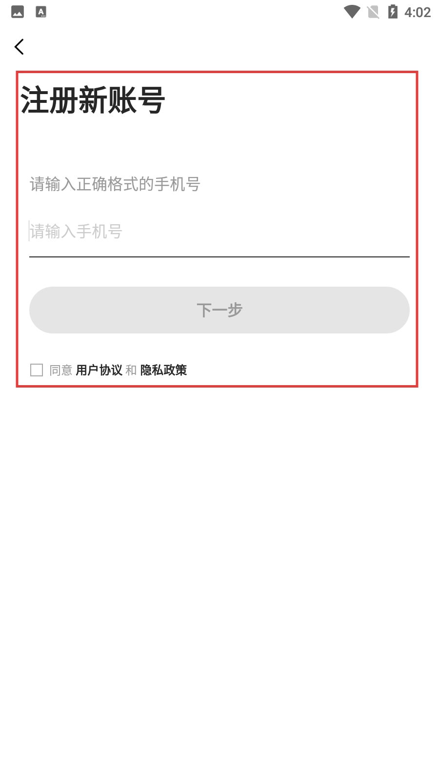 4、在注册界面,输入手机号并勾选协议,点击【下一步】完成新账号注册流程。