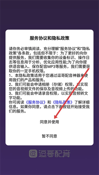 1、使用前需阅读【服务协议和隐私政策】,了解信息收集与权限申请后,点击【同意并使用】,进入逗哥配音神器主界面。