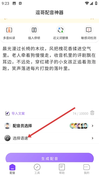 3、输入配音文字后,点击【选择语速】选项,进入语速设置界面,可根据需求调整配音语速。
