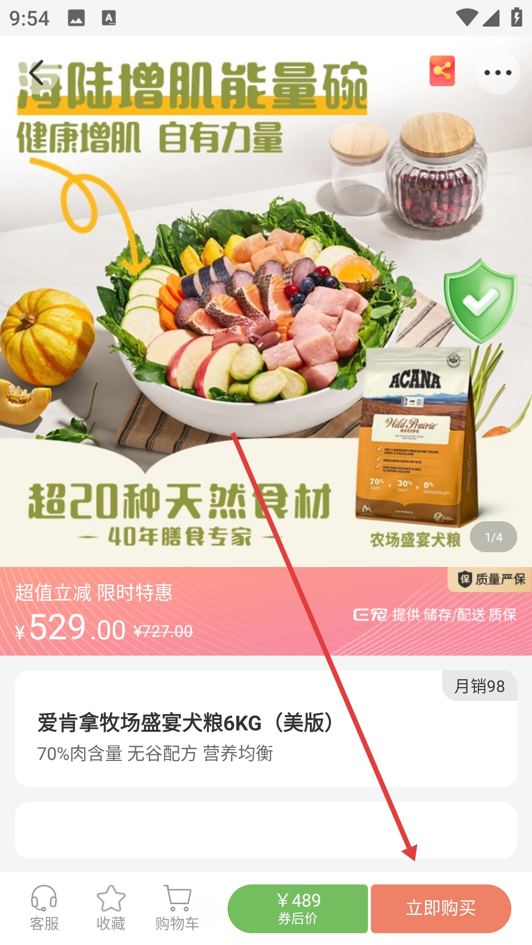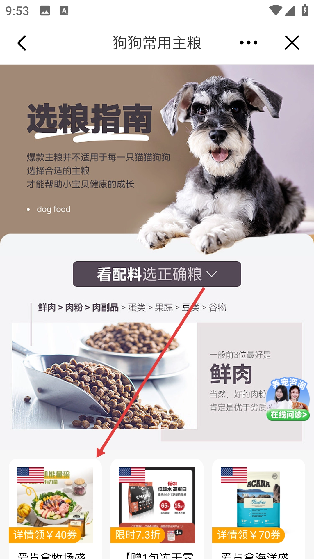 2、在狗狗常用主粮页面点击目标主粮(如爱肯拿牧场盛宴犬粮),进入商品详情页面。