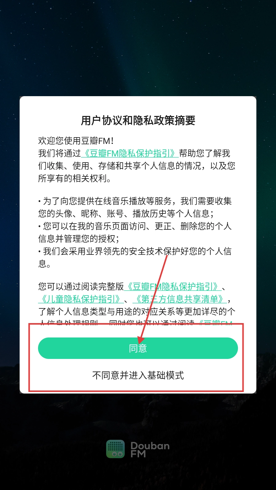 在使用豆瓣FM之前,你需要先阅读并同意相关的用户协议与隐私政策,只有点击【同意】按钮后,才能进入软件。