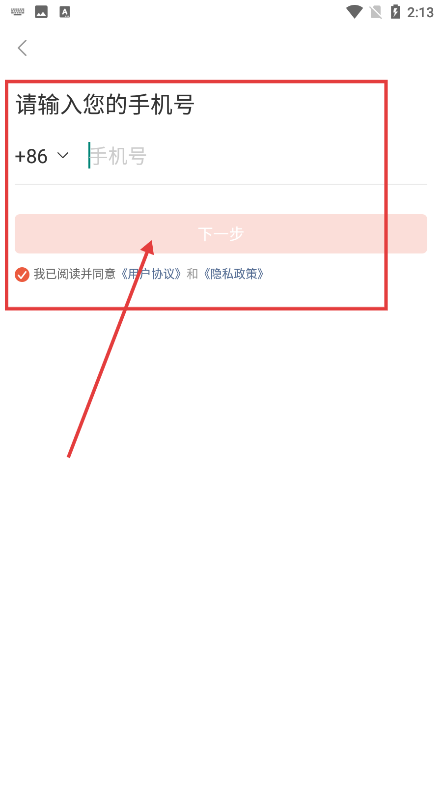 2、进入手机号输入界面后,填写手机号,同时勾选同意《用户协议》与《隐私政策》,接着点击【下一步】按钮。
