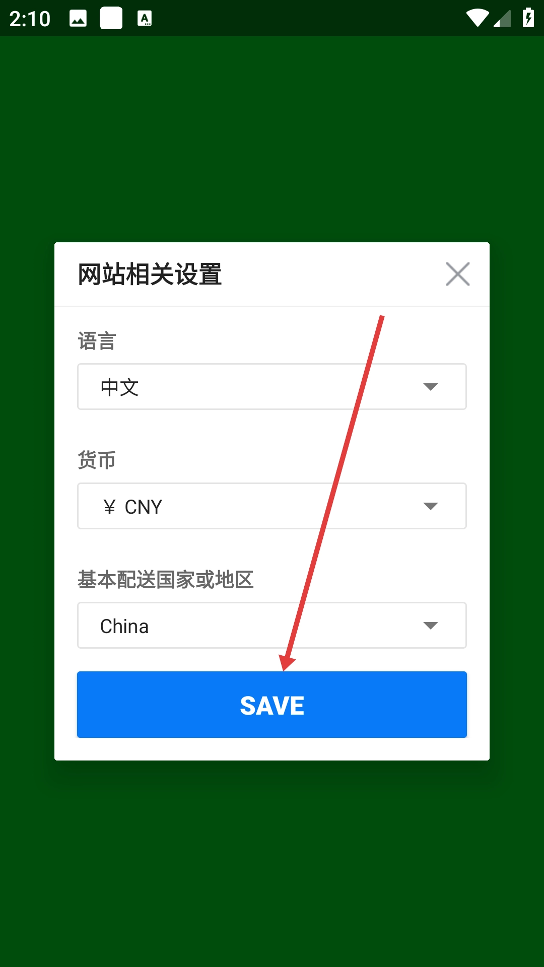 1、在网站相关设置页面完成语言、货币、配送地区设置后,点击【SAVE】保存设置。