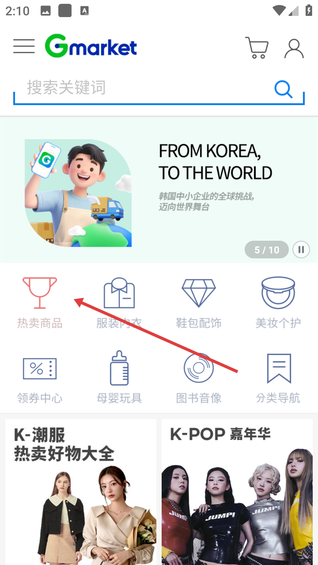 2、在Gmarket首页点击【热卖商品】,进入热卖商品分类页面。