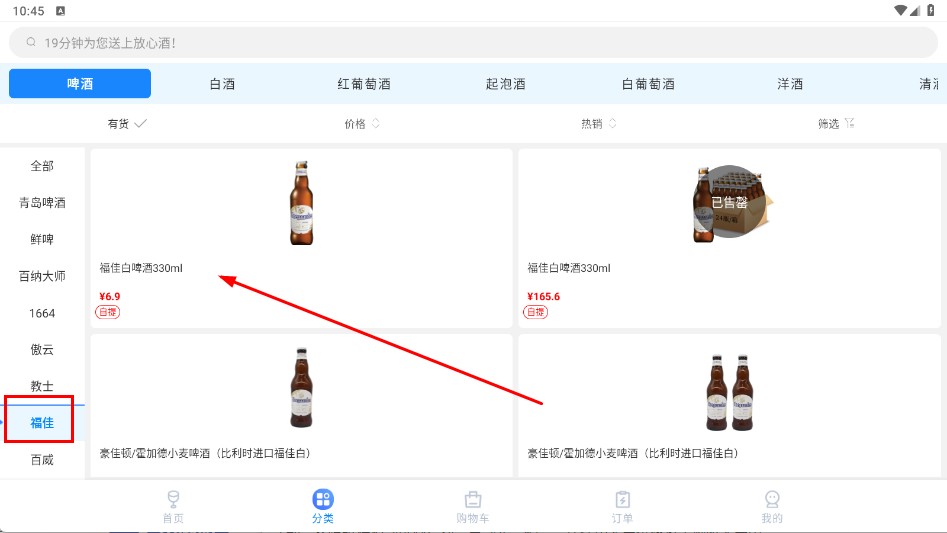 2、在啤酒分类页面选择品牌如(福佳),并点击对应商品(如福佳白啤酒330ml),进入商品详情页。