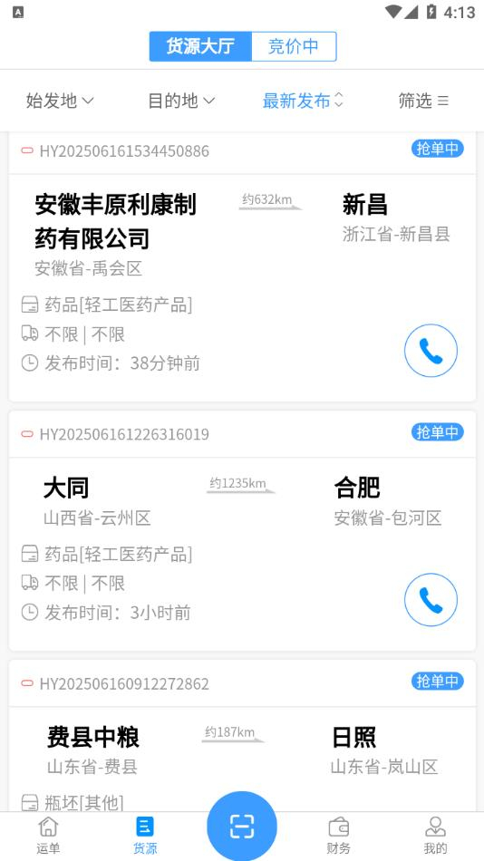 1、在货源大厅查看正在竞价的货源以及最新发布的货源信息,全面了解货物名称、运输距离、运费等详细内容。