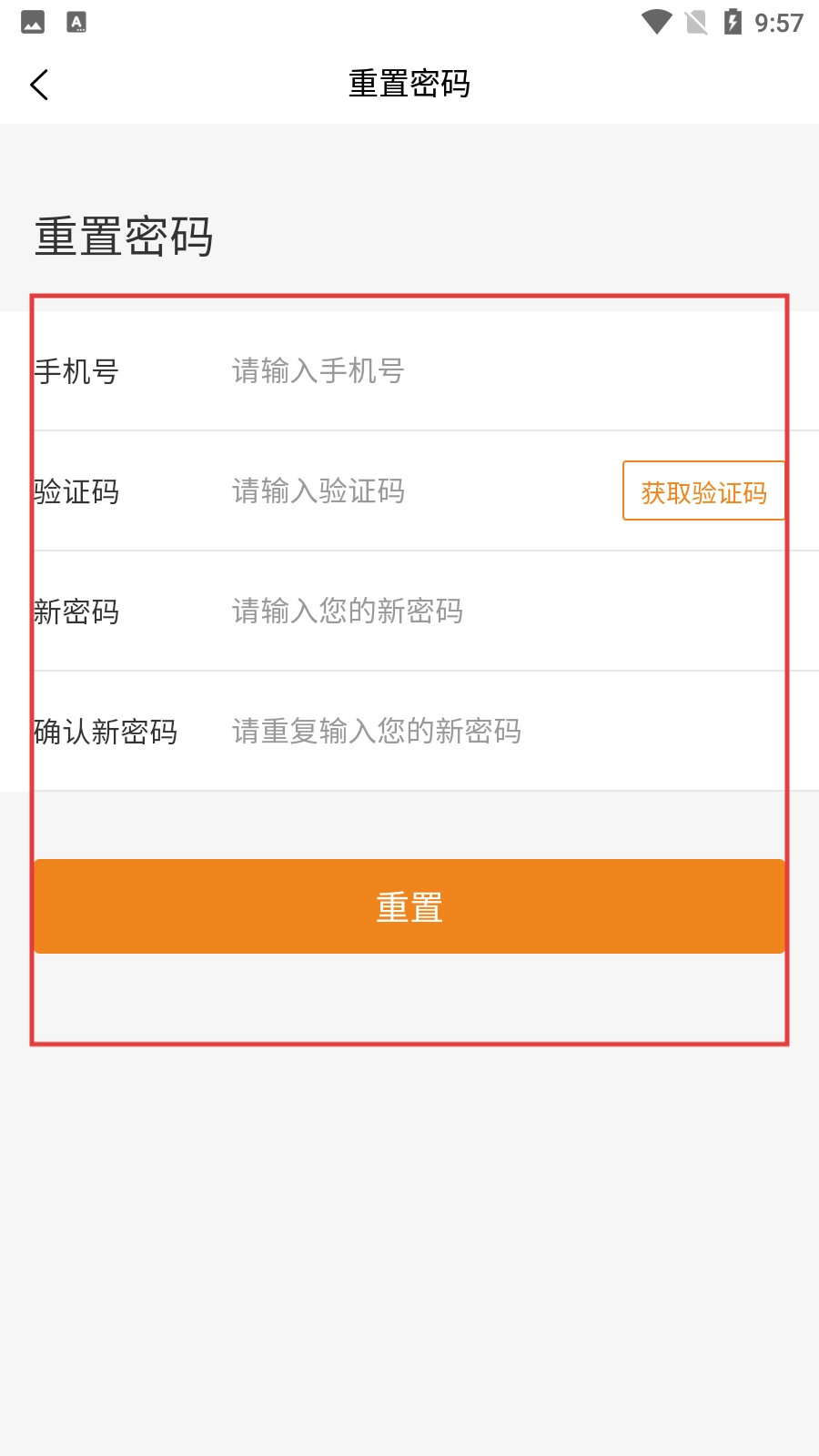 3、在重置密码界面,依次输入手机号、验证码、新密码和确认新密码后,点击【重置】按钮,可完成密码重置操作。