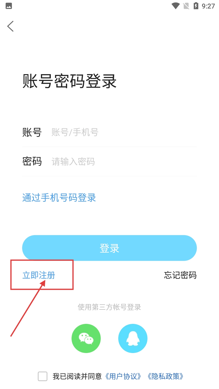 3、在账号密码登录页面,点击【立即注册】按钮,可进入注册流程的手机号码输入页面。