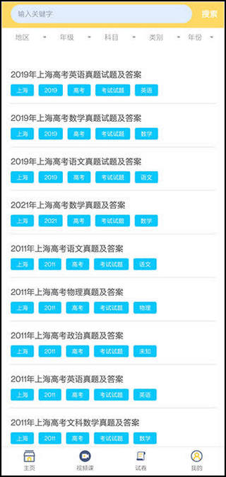 3、在试卷模块,学生能够开展模拟考试,可自主选择地区、年级、科目、类别等。
