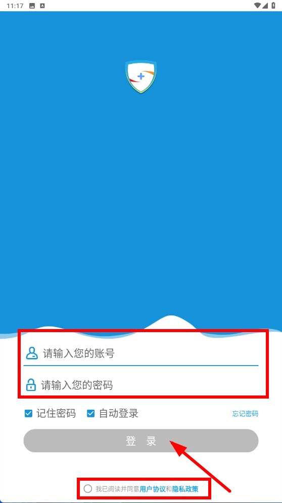 2、在登录页面输入账号、密码,勾选同意协议后点击【登录-功能按钮】。