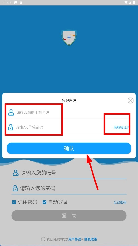 3、在忘记密码页面输入手机号、验证码后点击【确认-功能按钮】完成密码重置。