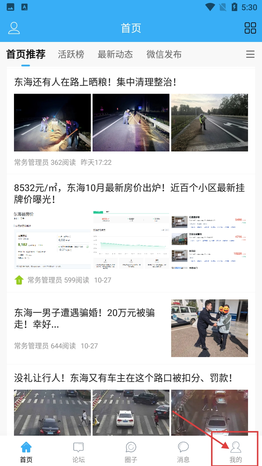 1、在该资讯类首页,点击底部【我的】按钮,可进入个人中心界面。