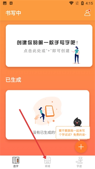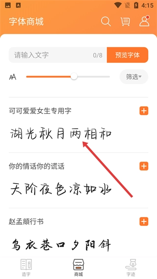 1、点击底部的【商城】按钮,进入字体商城页面,开启字体浏览的旅程。