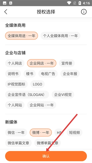4、在授权选择页面确认所选内容后,点击【确认】按钮,即可完成商用授权的操作流程。