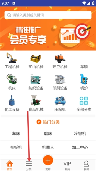 进入软件后,点击底部的【分类】选项,即可看到工程机械、矿山机械等不同分类,大家可以根据自身需求选择对应的机械类别入口。